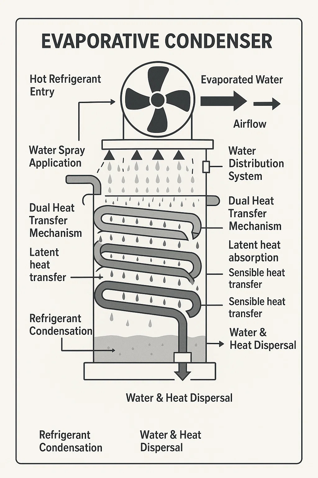 Evaporatif kondansatörler, hava soğutmayı su buharlaştırmayla birleştirerek ısıyı reddeder. Yalnızca duyulur ısı transferine dayanan standart kondansatörlerin aksine, suyun buharlaşması sırasında gizli ısı emiliminden yararlanırlar.