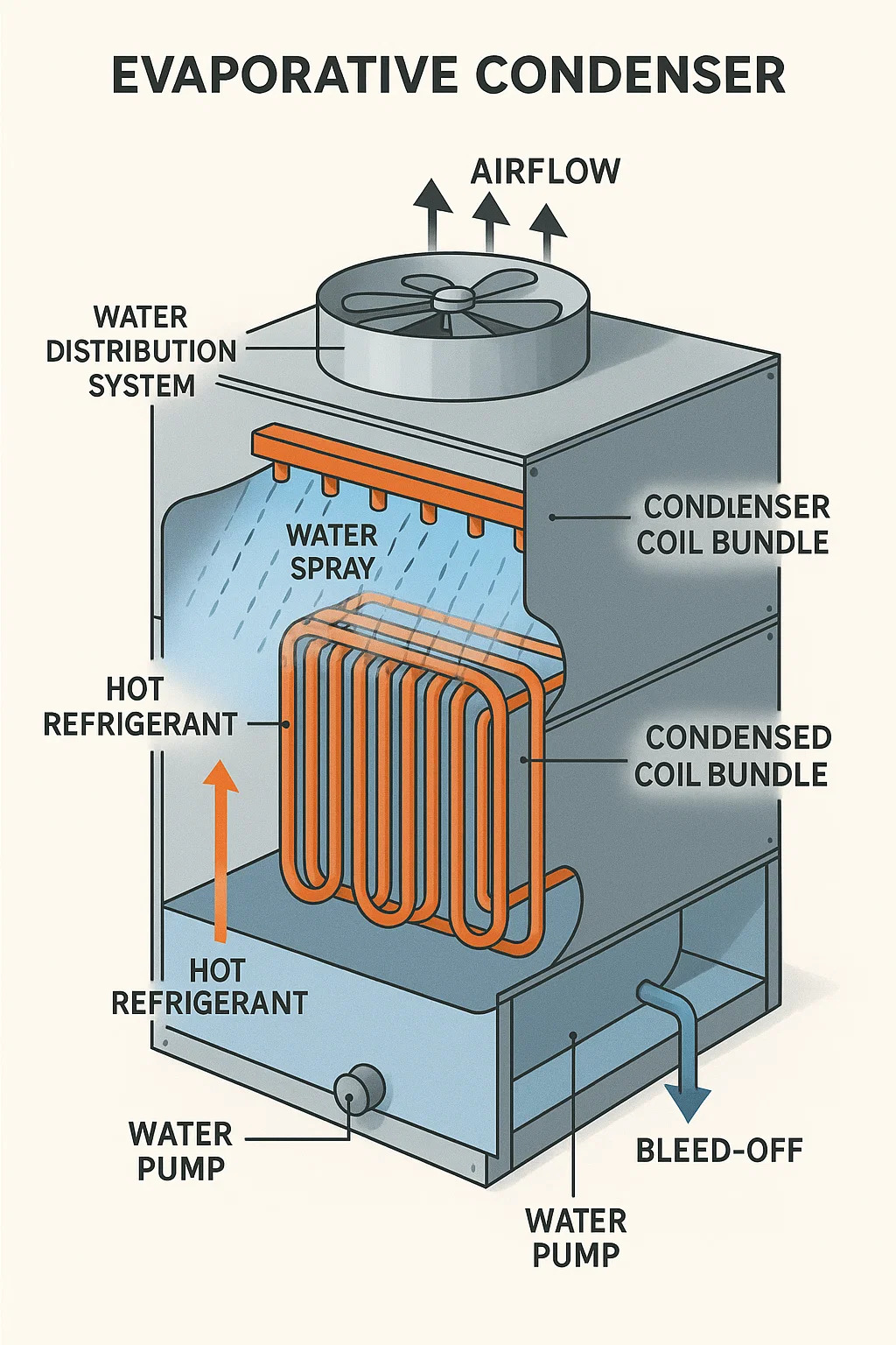 Bir buharlaşmalı kondansatör Soğutma sistemlerinden gelen ısıyı uzaklaştırmak için hava soğutmayı ve su buharlaştırmayı entegre eder. Tasarımı ve çalışması standart hava soğutmalı kondenserlerden temel olarak farklıdır:
